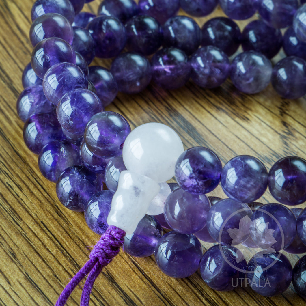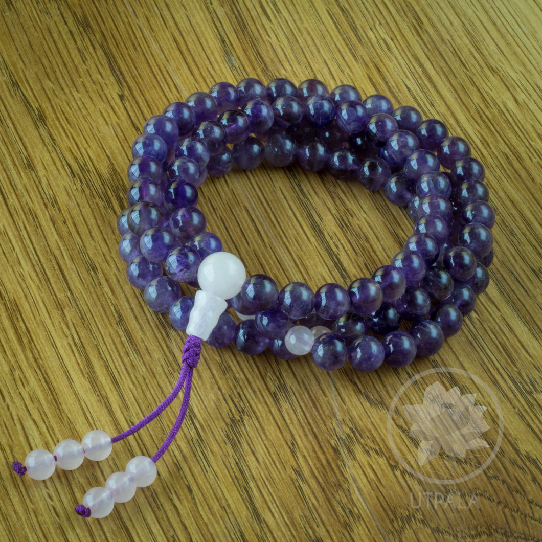 Mala de amatista con detalles de cuarzo rosa de montaña de 108 cuentas hecha en Nepal